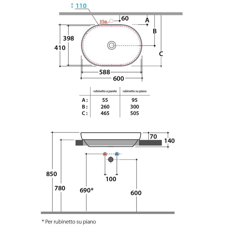 Il LAVABO DA APPOGGIO GLOBO T-EDGE B6O61PN 60X41 CM IN CERAMICA NERO OPACO CON PLIETTA INCLUSA è compatibile con tutti i miscelatori lavabo alti e a parete. Il prodotto non presenta foro troppopieno ed è dotato di piletta.