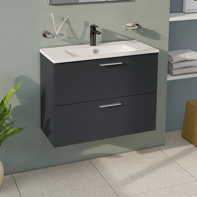 Il moblie bagno sospeso della gamma Vitra Mia non è solo un elemento estetico, ma uno strumento pensato per semplificare i gesti di ogni giorno, con soluzioni pratiche che si integrano in un contesto elegante. È composto da due ampi cassetti caratterizzati dalla tecnologia soft-close, che garantisce una chiusura rallentata e delicata, senza improvvisi impatti rumorosi. L’apertura avvene tramite maniglie a barra corta realizzate i plastica. La finitura antracite lucido dona originalità e modernità al tuo ambiente bagno. Nella composizione è inclusa la specchiera, quest'ultima caratterizzata da un design squadrato, che non prevede la cornice, rendendolo ancora più moderno. Oltre alla specchiere è inclusa la lampada a led. Il MOBILE BAGNO SOSPESO VITRA MIA 80 CM ANTRACITE LUCIDO, è composto da un lavabo in ceramica, che dona maggiore luminosità con la sua finitura bianco lucido. Inoltre il lavabo è dotato di foro troppopieno ed è caratterizzato da mensole laterali, le quali diventano un ottimo piano per poter appoggiare qualsiasi oggetto.