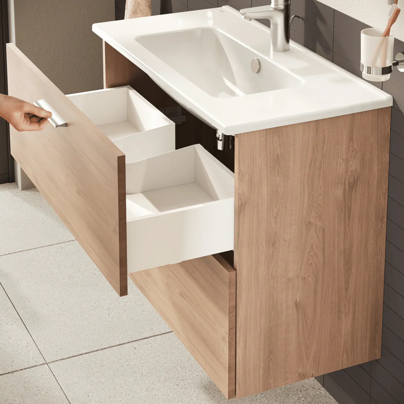 Il moblie bagno sospeso della gamma Vitra Mia non è solo un elemento estetico, ma uno strumento pensato per semplificare i gesti di ogni giorno, con soluzioni pratiche che si integrano in un contesto elegante. È composto da due ampi cassetti caratterizzati dalla tecnologia soft-close, che garantisce una chiusura rallentata e delicata, senza improvvisi impatti rumorosi. L’apertura avvene tramite maniglie a barra corta realizzate i plastica. La finitura golden oak effetto legno dona originalità e brillanztezza al tuo ambiente bagno. Nella composizione è inclusa la specchiera, quest'ultima caratterizzata da un design squadrato, che non prevede la cornice, rendendolo ancora più moderno. Oltre alla specchiere è inclusa la lampada a led. Il MOBILE BAGNO SOSPESO VITRA MIA 80 CM GOLDEN OAK EFFETTO LEGNO, è composto da un lavabo in ceramica, che dona maggiore luminosità con la sua finitura bianco lucido. Inoltre il lavabo è dotato di foro troppopieno ed è caratterizzato da mensole laterali, le quali diventano un ottimo piano per poter appoggiare qualsiasi oggetto.