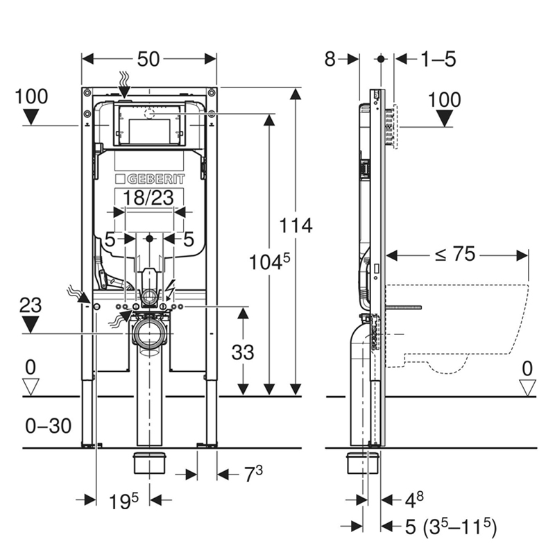 Il MODULO GEBERIT DUOFIX PER VASO SOSPESO 114 CM CON PLACCA BIANCA E CANOTTO, è ideale per il montaggio in installazioni applicate davanti alla parete ad altezza parziale o totale, per vasi sospesi con sporgenza elevata fino a 75 cm, per altezze del pavimento 0-30 cm.