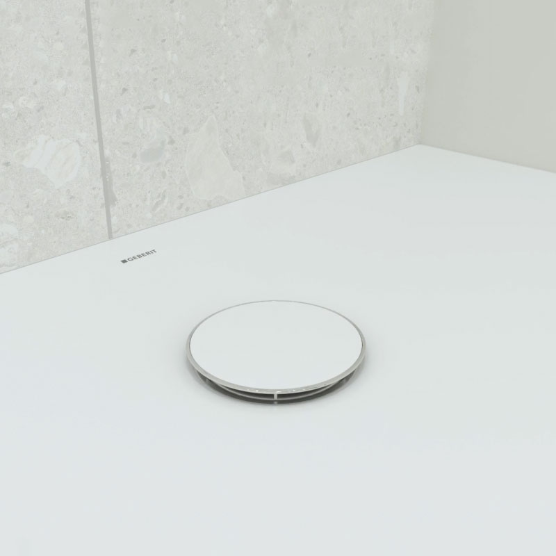 Il piatto doccia Geberit OLONA in marmoresina è caratterizzato dalla doppia modalità di installazione a filo pavimento o in appoggio, presenta un foro di scarico posteriore al centro dal diametro di 90 mm ed è incluso di inserto a pettine e tappo per piletta in tinta, ornato da un raffinato bordino cromato.