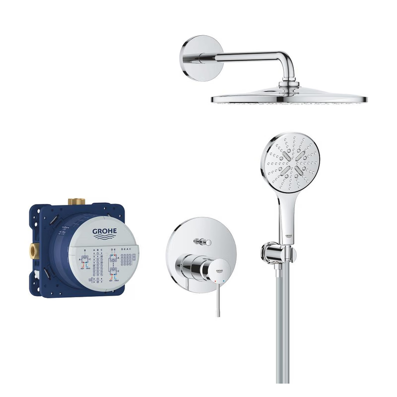 Il SET DOCCIA GROHE RAINSHOWER ESSENCE 25287000 310 MONO CROMATO LUCIDO, è composto da soffione modello Rainshower con diametro 31 cm e braccio con lunghezza 42,2 cm, doccetta a mano modello SmartActive, corpo incasso SmartBox e piastra per corpo incasso modello Essence.