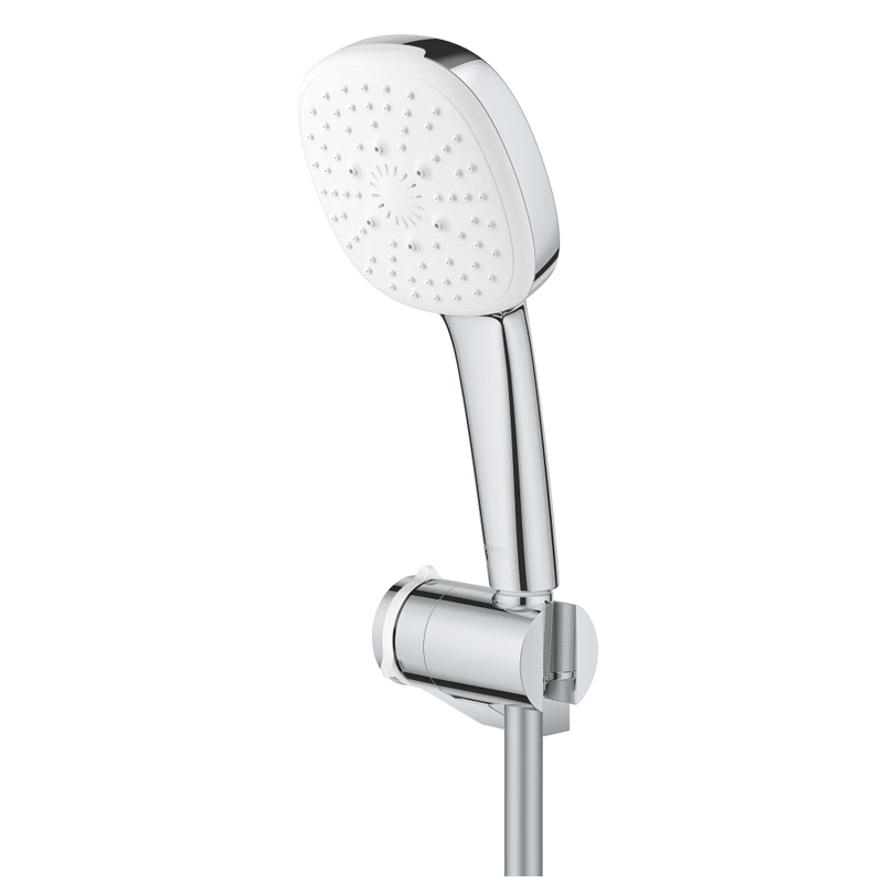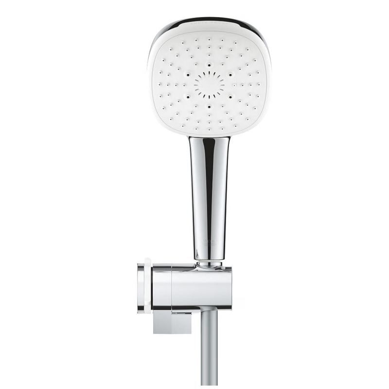 Il SET MANOPOLA DOCCIA GROHE TEMPESTA CUBE 110 27584003 A 3 GETTI CROMATO, è composto da doccetta Tempesta Cube con diametro 110 mm e supporto a parete regolabile per manopola doccia.