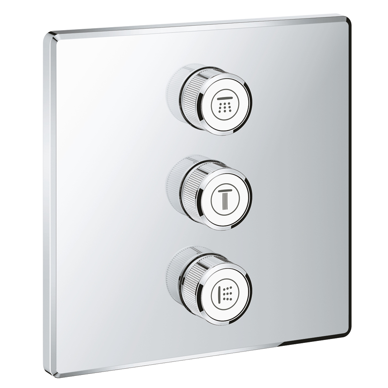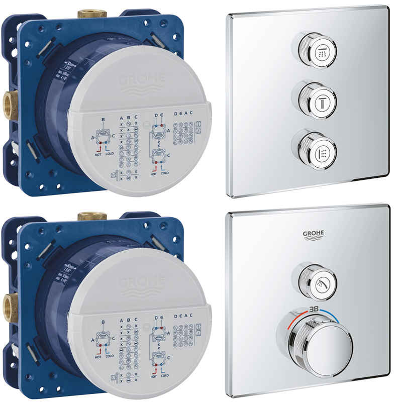 Il SET MISCELATORI DOCCIA GROHE GROHTHERM SMARTCONTROL TERMOSTATICI A 4 VIE CROMATO è composto da: 2 pezzi di corpo incasso Grohe SmartBox codice 35600000, i quali comprendono corpo incasso universale, guarnizione e dima di montaggio; il miscelatore termostatico ad 1 via Grohterm SmartControl codice 29123000 e la piastra esterna termostatica a 3 vie Grohtherm SmartControl codice 29127000.